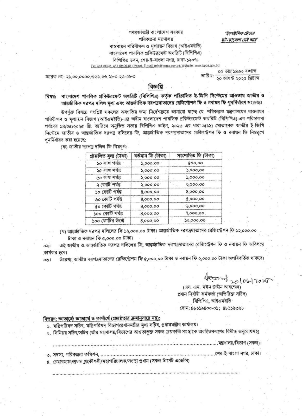 বাংলাদেশ পাবলিক প্রকিউরমেন্ট অথরিটি (বিপিপিএ) কর্তৃক পরিচালিত ই-জিপি সিস্টেমের আওতায় জাতীয় ও আন্তর্জাতিক দরপত্র দলিল মূল্য এবং আন্তর্জাতিক দরপত্রদাতাদের রেজিস্ট্রেশন ফি ও নবায়ন ফি পুননির্ধারণ সংক্রান্ত বিজ্ঞপ্তি